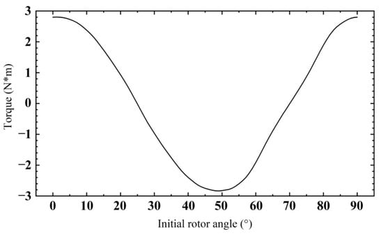 The torque of the rotor will change according to the relative position between the stator and the rotor, so adjusting the appropriate rotor angle can provide the maximum torque output for the rotor. According to the relationship curve between rotor torque and rotor initial angle in Figure 21, it can be concluded that strong torque can be generated when the initial angle is 49°. The generated torque is 2.9 N·m.