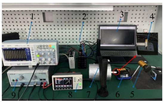 The experimental platform (1. Oscilloscope, 2. Controller, 3. PC, 4. Attitude Sensor 5. Magnetic Base, 6. Laser Sensor, 7. Prototype, 8. Signal Generator, 9. Voltage Amplifier).