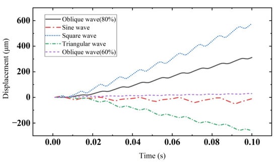 Figure 23 shows the relationship between the displacement of the rod and time under different voltage signal waveforms. Through the comparison in the figure, it can be concluded that under the action of the same time and excitation Vp-p, the displacement generated by the square wave is the largest. Therefore, when the actuator needs to output a large displacement within a certain time, the square wave can be selected for output. The triangular wave is an oblique wave with 50% symmetry. In the figure, the triangular wave produces the maximum reverse displacement. The oblique wave with 80% symmetry produces large forward displacement. Therefore, the actuator can be driven forward and backward according to the change in oblique wave symmetry to make better use of the actuator.