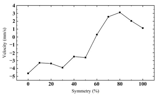 Figure 24 shows the relationship between the velocity of the mover and the symmetry of the oblique wave. The excitation amplitude applied to PEAs is 100 V. It can be seen from the figure that when the symmetry is 0%, the reverse velocity generated by the mover obtains its maximum. When the symmetry is 80%, the forward velocity of the mover obtains its maximum. According to changing the symmetry of oblique wave excitation, the characteristic of the driving direction of the actuator to the mover can be changed, which is convenient for the later control work. The symmetry of oblique wave excitation is selected as 80%, and the forward motion of the mover is analyzed.