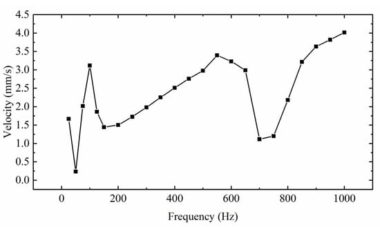 When the symmetry of oblique wave excitation is 80% and Vp-p is 100 V, the relationship between mover velocity and excitation frequency is shown in Figure 25. It can be seen from the figure that there are three peaks in the curve during the change process, which are 100 Hz, 550 Hz, and 1000 Hz, respectively. The fluctuation before and after 550 Hz is relatively gentle, and the mover speed is relatively high. The speed is higher at 1000 Hz, but the higher the frequency, the higher the accuracy of control. It mainly studies the output performance at low frequency, so 100 Hz is selected for the following analysis.