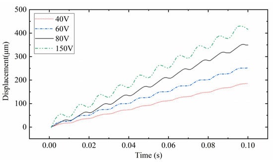 Figure 26 shows the relationship between the displacement and time of the mover under different Vp-p. The frequency of voltage excitation is 100 Hz. As shown in the figure, each displacement track is a stepped rising track. The curve from top to bottom in the figure is the curve when the excitation Vp-p is 150 V, 80 V, 60 V, and 40 V. The greater the voltage excitation Vp-p, the more obvious the reverse displacement produced by the mover. The reverse displacement hinders the movement of the mover and affects the stability of PEAs. Therefore, when there are no requirements for speed and displacement, the smaller Vp-p can be selected as far as possible to ensure the smooth movement of the mover.