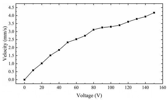 Figure 27 shows the relationship between the velocity of the mover and the excitation amplitude. With the increase in excitation amplitude, the velocity of the mover increases gradually, and its increasing trend increases rapidly at first and then gently. On this basis, it is found that when Vp-p is about 100 V, the velocity of the mover is relatively stable, and it is the initial part of the slow velocity growth region. Therefore, to consider the working efficiency and stability of the actuator, 100 V is selected as Vp-p excited by the PEAs. It can output a relatively stable speed of 3.4 mm/s. It is proved that the actuator has good output performance.