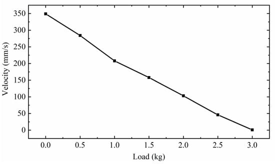 Figure 28 shows the relationship between the speed of the mover and the load capacity of the actuator. The applied voltage excitation is 150 V, 3.4 kHz. At this time, the actuator works in the high-frequency region of excitation, and the excitation amplitude is the largest, so the driving speed is the fastest. It can be seen from the figure that under no load, the speed of the mover is 348 mm/s. With the increase in load weight, the speed of the mover decreases gradually. Finally, when the load is 3 kg, the speed of the mover is close to 0. Therefore, the load capacity of the actuator is 3 kg. It is proved that the actuator has a high load capacity.