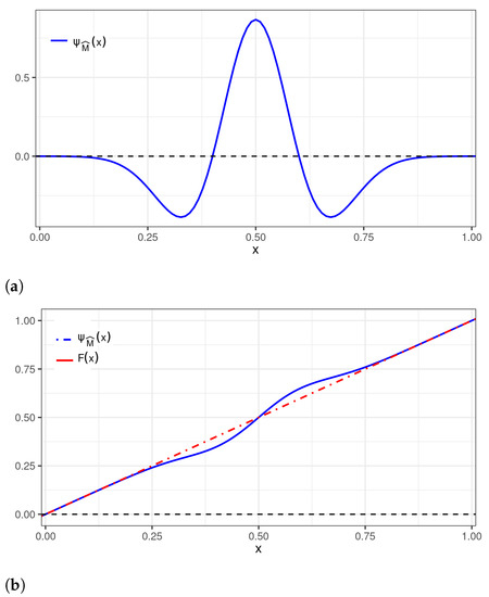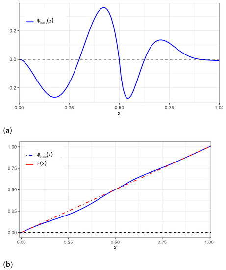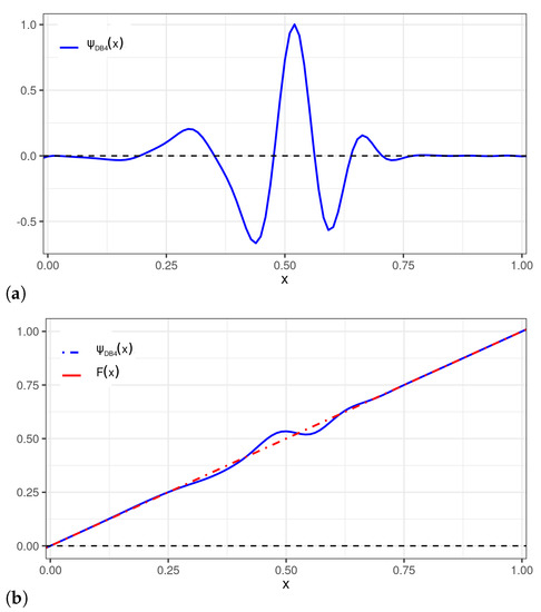 Note that the properties formulated in (6)–(8) are helpful. To begin with, let us deal with the uniform distribution, denoted as , whose CDF is given by , for , where , for , and , for . A mapping is proposed to bring the support [0, 1] of the uniform distribution to the support of the wavelet, that is, . Then, we propose to choose a particular perturbation according to