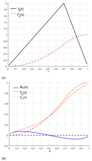 From the formulas given in (11) and (12), it follows that and , for all x, thereby proving that this is indeed a valid PDF to be considered. Then, this new PDF and its associated CDF might be visualized as a privatized version of the reference distribution, with the privatization mechanism being named wavelet perturbation. This is that we call “privatization analysis”.