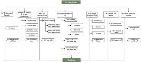 We have organized the rest of this paper as follows: Section 2 provides a summarized explanation of the key terminologies and security technologies used in IoT NIDS design. We classify the IoT security threat classes in Section 2 and introduce the fundamental security routines with attention to NIDS diversities. Section 3 describes the background of NIDS in IoT systems. This section also elaborates on the various types or categories of NIDS. In Section 4, we discuss how MEC are used to create NIDS, its design process, deployment strategies, and implications toward the heterogeneous IoT systems. Section 5 examines the mode of implementation of NIDS in IoT, while Section 6 examines the NIDS design strategies. Then, we compare and evaluate the various implementations of ML-based NIDS, datasets, and metrics used in NIDS design for IoT systems in Section 7. Finally, the survey concludes with an outline and future directions in Section 8. Figure 1 shows the brief taxonomy of the survey. Table 1 also provides some of the commonly used acronyms in this survey.