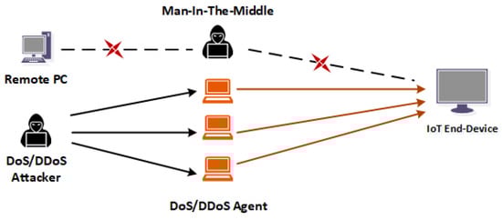 - Denial of Service (DoS): A cyber-attack makes IoT systems or resources on the network unavailable to the intended legitimate users. These attacks are launched by the perpetrators to temporarily or permanently disrupt a host IoT system’s services [41,42,43].