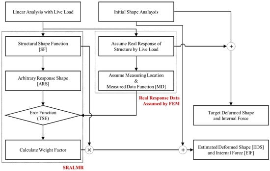 SRALMR is applied to estimate the deformed shape and internal force generated by a live load because the sensor usually measures the response data generated by the live load. Therefore, the SSF and ARS required for estimation are derived from a linear analysis with a live load. The error function is then established using the ARS and MD. The deformed shape and internal force were estimated using the calculated weight factor to minimize the error function. Finally, the SRALMR was validated by comparing the results of the estimated and target models.