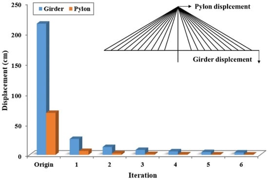 The deformation and internal force of a cable-stayed bridge are critically dependent on the cable force. Therefore, it is important to determine the cable force and initial equilibrium state to minimize the deformation under dead loads. Various methods of initial shape analysis, such as the trial-and-error approach, successive substitution method, and target configuration under dead load (TCUD), have been suggested [33,34,35]. In this study, the initial force method was used to determine the initial equilibrium state of the validation model. In the initial force method, the geometric nonlinear analysis is repeated considering the internal force of all members at the current iteration as an initial internal force at the next iteration. Figure 3 presents the displacement of the girder center and pylon top according to the number of iterations. The cable forces for the original model are zero, and the appropriate cable forces that satisfy the equilibrium state under a dead load are determined by iteration. As the iterations progressed, the displacement converged to zero. The displacements of iteration 6 were 3.86 cm for the girder center and 0.38 cm for the pylon top. This is negligibly small compared to the span length of 450 m. Therefore, the deformed shape and internal force at iteration 6 were used for the results of the initial shape analysis.