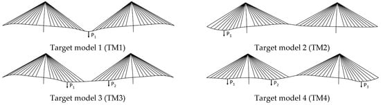 In this study, the target models used for the validation of SRALMR were derived using the numerical model. Figure 4 presents the deformed shape of the target model according to the applied force, and the magnitudes of each force are presented in Table 2. The static load is applied for target models, and the magnitudes of each load are determined for sufficient variation of internal force compared to the initial internal force generated by self-weight. Only one concentrated load is applied to each span for TM1 and TM2. Different loads act on two points for TM3. TM4 is the most complex case, in which three different loads are applied. The displacement, slope, and strain data of each target model were used as the measurement data for the validation of SRALMR.