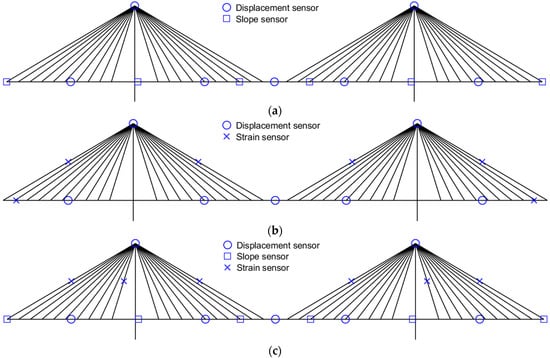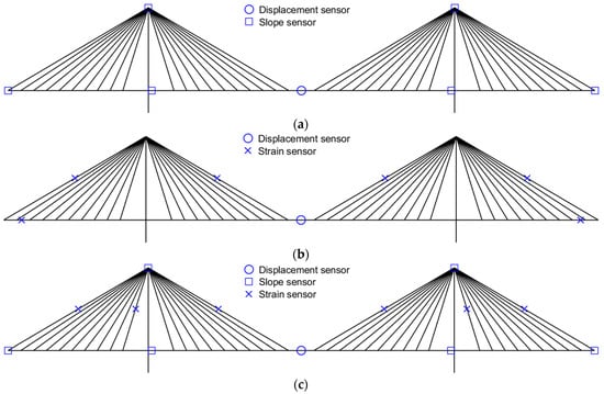 If the sensor location is determined via the EI-DPR-distance method, the sensor layout case is numerous according to the number of each response sensor due to the distance coefficient. For this reason, the only example of measurement location using one displacement sensor and seven displacement sensors is represented in Figure 5 and Figure 6, respectively. As shown in Figure 5a and Figure 6a, the measurement location of the slope is different due to the measurement location of the displacement. In addition, Figure 5b,c shows the different measurement locations of the strain due to the measurement location of the slope. All combinations of response data are used for deformed shape validation and only three combinations of response data are used for internal force validation.