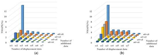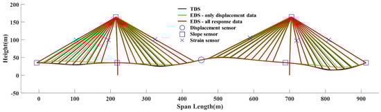 Figure 7 presents the NMAPE of EDS according to the number of measurements. The NMAPE is calculated considering the vertical and horizontal deformed values of all the nodes. The maximum NMAPEs are 11.04% for TM1, 11.10% for TM2, 11.51% for TM3, and 13.51% for TM4. The difference in the maximum NMAPE for each TM is not large because the deformed shape of the pylon can be estimated using only one displacement data point on the girder center. The NMAPE of the EDS decreased as the number of measurement data points increased. The estimation results demonstrated that displacement data, including vertical and horizontal values, are the most effective estimation responses. However, slope and strain data, including only one-dimensional values, can also be used to enhance the estimation accuracy. Namely, slope and strain data can reduce the number of expensive GNSSs required to estimate the proper deformed shape. Figure 8 presents the position of the sensors for each response and the enhancement of the estimation accuracy by the slope and strain data. The target deformed shape (TDS), EDS with only one displacement data, and EDS with one displacement data, six slope data, and six strain data are compared in Figure 8.