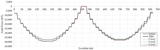 The girder axial force that significantly occurs owing to the horizontal component of the cable force should be considered to evaluate the performance of cable-stayed bridges. Figure 9 presents examples of the initial, target, and estimated girder axial forces for TM4. The initial line represents the axial force derived from the initial shape analysis, considering the dead load. The maximum axial force is generated at the junction between the girder and pylon, and the minimum axial force is generated at the center of the girder.