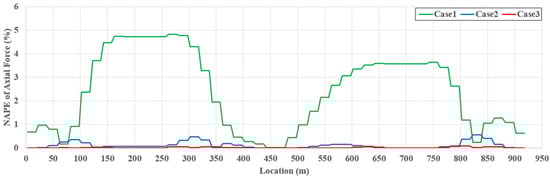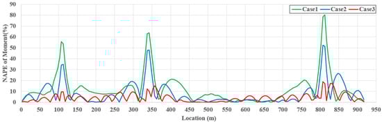 Figure 12 presents the NAPE of the moment along the girder span length for TM4. Based on the stiffness method, the girder moment was determined by the relative displacement and rotation of the end node at the element. Even a small error in the relative displacement and rotation can cause a large moment-estimation error. SRALMR estimates the deformed shape by minimizing the difference between the ARS and MD only at the locations where the sensors are installed. Additionally, the concentrated load applied to the target model caused a large relative displacement and rotation near the location where the load was applied. Therefore, the estimation error for the moment is generally larger than that for the axial force, and a large error occurs, particularly at the load locations. The maximum NAPEs of the girder moment for TM4 were 80.15, 52.45, and 18.98% for case 1, case 2, and case 3, respectively. The addition of measurement data significantly decreased the estimation accuracy.