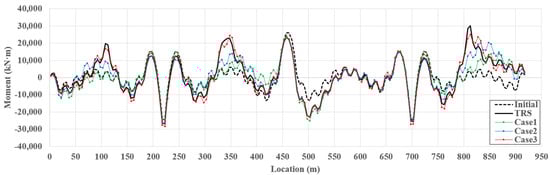 A girder moment is an important factor that should be considered when evaluating the performance of bridges with long spans, such as cable-stayed bridges, where the distribution of girder moment is complex owing to the vertical component of the cable force. An example of the initial, target, and estimated girder moments for TM4 is shown in Figure 11. In the initial shape analysis, the positive moment was mainly large at the girder center, and the negative moment was mainly large at the connection between the girder and pylon. The final girder moment is then determined according to the location and magnitude of the live load.