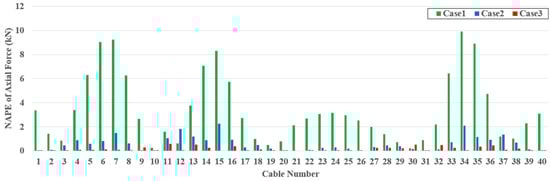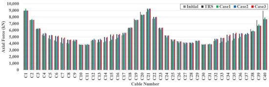 Figure 13 represents examples of the initial, target, and estimated cable forces for TM4. The target and estimated cable forces were determined by superposing the cable forces generated by the dead and live loads. Owing to the dead load, the cable forces near both ends of the girder and the girder center are relatively large. The NMAPE for each case for TM4 is shown in Figure 14. A large estimation error of approximately 10% occurred at a certain cable for case 1. However, the estimation error for case 2 dramatically decreases compared to that of case 1, and the estimation error of case 3 is almost zero. Similar to the girder axial force and moment, strain and slope data can be used as additional data to improve the estimation accuracy for the cable force. In addition, the exact cable force can be determined if sufficient multi-response data are provided. The tendency for improvement in the estimation accuracy is represented equally in Table 5.