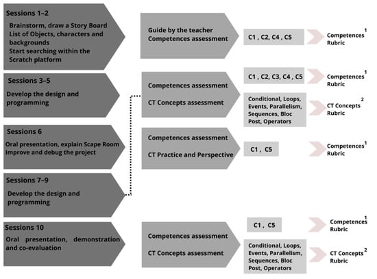Students present the PBL outcome as if it were the final project of the Scape Room using the block-programming platform Scratch™. As this was the second year of use of this platform, they were building on previous knowledge, and therefore, it was not necessary to give a conceptual introduction to the contents of the platform. During the work sessions, the students developed the history and programming of the Scape Room, and the teacher served as a guide to dispel their doubts and support them to produce a final product.