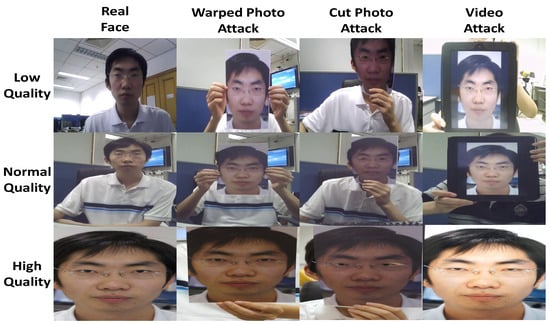 Among the popular databases designed for the presentation attack detection application, one can find the Replay-Attack database []. This database consists of 1300 video of real-access and attack attempts to 50 subjects, (See Figure 4). However, these videos were taken using a built-in webcam on a MacBook laptop under two separate scenarios (controlled and adverse). In addition, two cameras were used to create the faked facial attack for each person in high-resolution images and videos: a Canon PowerShot SX150 IS and an iPhone 3GS camera. Moreover, fixed attacks and hand attacks are the two types of attacks. There are ten videos in each subset: four mobile attacks with a resolution of pixels on an iPhone 3GS screen, then, by using a first generation iPad with a screen resolution of pixels, four high-resolution screen attacks were performed. On A4 paper, two hard-copy print attacks (printed on a Triumph-Adler DCC 2520 colour laser printer) occupied the whole available printing surface. It should be noted that the complete set of videos is divided into three non-overlapping subsets for training, development, and testing in order to evaluate them.