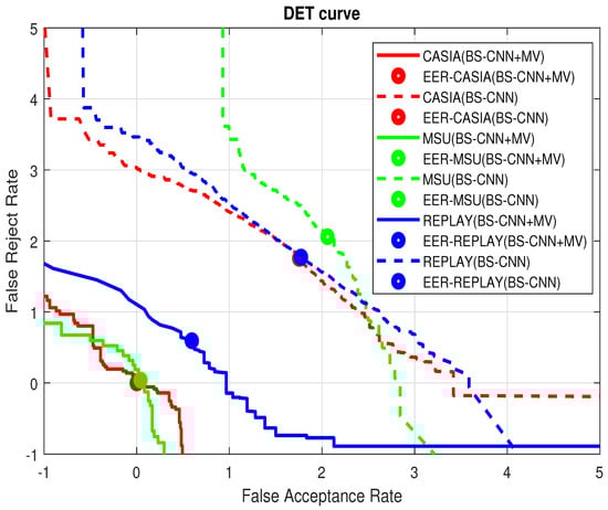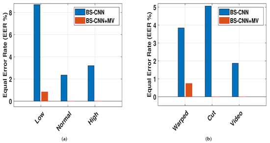 Moreover, we found that combining MV with BS-CNN yields the best results for picture quality (low, normal, and high), as well as with spoof media (warped photo, cut photo, and video attacks) (see Figure 6). This can be explained by the fact that MV improves decision-making performance. Table 2 shows that our proposed technique outperforms the CASIA baseline in all scenarios when compared to the database created by CASIA [].