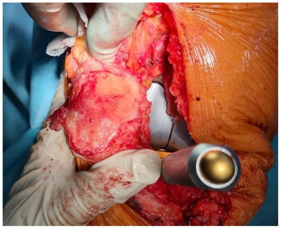 Both arthroscopic and TKR surgeries were performed in a typical manner by orthopedic surgeons trained and specialized in this field. For arthroscopy, a typical 30-degree scope was utilized and standard anteromedial and anterolateral portals created for instrument placement. After introduction of the scope into the joint cavity, a standardized knee evaluation was performed with the probing of cartilage. The degree of cartilage damage was evaluated according to the International Cartilage Repair Society (ICRS) guidelines [74,75]. The same classification was used for evaluation of chondral lesions during TKR; however, in those surgeries evaluation was performed without magnification of the arthroscope. In this study, we have not included any TKR with patellar resurfacing; therefore, the patellar cartilage was evaluated in situ, and the patellar groove of the femur was evaluated after resection of the articular surface. This approach was based on a surgical technique that was not altered for this study. Arthroscopic and direct visualization of the cartilage provide the best evaluation method, which was shown in exemplary views from an arthroscopic evaluation of a PFJ in Figure 1 and direct visualization during TKR in Figure 2.