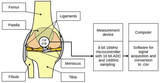 Bone vibrations were converted to electrical signals by a dedicated CM01B solid body microphone [76] placed on the patella as shown in Figure 3. This device allowed for conversions of signals in the 10 Hz to 2 kHz bandwidth. Knee rotation was measured using a rotary encoder from Bourns [77], which provided a 10-bit continuous digital output based on rotation of an embedded magnet in 360 degrees, ten times per second. Additional hard stops were placed on the orthesis joint, limiting the rotation between 0 and 90 degrees. The analog data from the microphone were sampled by an Atmega2560 8-bit microcontroller with an analog to digital converter with 10 bits of precision. The sampling rate used was 1400 Hz with 10-bit resolution. Acoustic signals were recorded during lower limb movement in an open and closed kinetic chain. A kinetic chain is an engineering concept used to describe human movement that finds widespread use in clinical applications including sports medicine, rehabilitation, prosthetics, and orthotics [78]. We can define an open kinetic chain as a combination of sequentially arranged joints in which the distal segments are free to move, an example being the movement of the knee in a sitting position. The movements of the individual segments are independent of each other in this case. A closed kinetic chain is a system in which the distal segment is not free to move. The motion of one segment causes a specific motion of the other segments, and each segment is connected to at least two other segments [78]. For both closed and open kinetic chain tests, the time of one cycle involving 90°–0°–90° movement was approximately 2 s. Signals were recorded for 10 complete repetitions of the described procedure. Obtaining a uniform length of the recorded signals was not possible due to the variability resulting from the individual limitations of the test subjects. The stream of vibration and rotation data was sent via a serial/usb interface. Patient safety was ensured by means of galvanic isolation using an ADuM4160 USB 2.0 isolator chip [79]. The power source for the device was an 11.1 V 3 s Li-Ion battery. The main modules of the system are shown in Figure 4. Data were recorded by a computer and saved as a comma-separated values file. Both open and closed kinematic chains were used during measurements.
