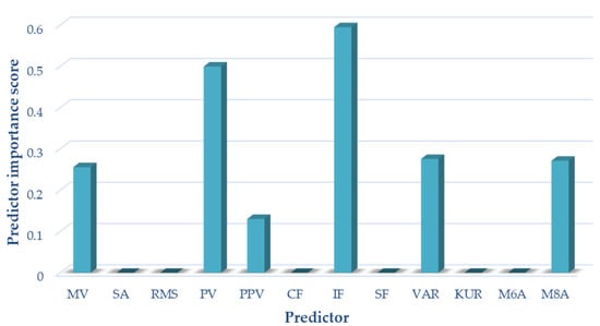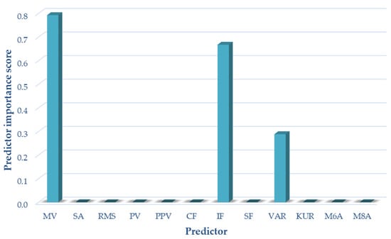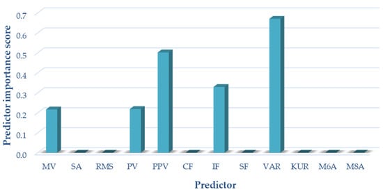 For variant II (sensor located on the patella, motion in a closed kinetic chain), the following measures of acoustic signals were selected based on the analyses performed using the NCA algorithm: mean value, peak value, interpeak value, impulsivity coefficient, variance, and M8A. These measures were used as input data for the variant II classification. The results of selecting the optimal measures for variant II are shown in Figure 7.