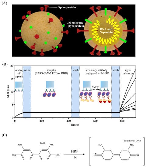 In this work, we used a fiber-optic biolayer interferometry (FO-BLI)-based biosensor for on-site and automated detection of SARS-CoV-2 within 13 min. The FO-BLI detection system was described in detail in our two recent papers [,]. When vertical light enters, the reflected light from the 1st and 2nd interface of sensors forms an interference curve. The curve moves in the direction of large wavelengths, along with the increase in the thickness of the biolayer of sensors. To achieve SARS-CoV-2 detection, a specific biotinylated neutralizing antibody (MA-RBD) was loaded on the fiber to target ECD and RBD in buffer and artificial samples. The SA biosensors (streptavidin) were commercial fibers that were coated with streptavidin previously. After that, binding between SARS-CoV-2 antigens and the specific secondary anti-S1 antibody conjugated with horseradish peroxidase (MA-S1-HRP) occurred, followed by the interaction between HRP and its substrate to generate sufficient optical signals (Figure 1B). 3,3′-diaminobenzidine (DAB), a common substrate to HRP often used in biology, has proven to be an appropriate enhancer for generating signals in the FO-BLI system (Figure 1C). Considering the potential toxicity of DAB, this work also aimed to search for an alternative enhancer for the FO-BLI technique to achieve both desirable assay performance and environmental and human friendliness. From this perspective, this work utilized an advanced product of 3-amino-9-ethylcarbazole, namely AMEC, to interact with HRP to further improve the optical signals. Similar to DAB, in AMEC staining, AMEC was oxidized by hydrogen peroxide in a reaction typically catalyzed by HRP to form a precipitate at the site of HRP. However, data regarding AMEC-based signal enhancement in the FO-BLI system has rarely been reported. The chemical structure of AMEC is still secretive about the details. In this study, we compared the assay performance for SARS-CoV-2 detection using the two enhancers. The outperformed enhancer was further evaluated regarding its clinical outcome using artificial saliva and serum.