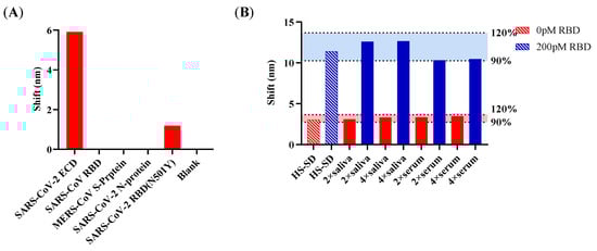Evaluation of the cross-reactivities and the effect of sample matrix for the AMEC-based FO-BLI biosensors. (A) Evaluation of the assay cross-reactivity towards SARS-CoV, SARS-CoV-2, and MERS; (B) Evaluation of the effect of dilution of serum and saliva on RBD measurement.
