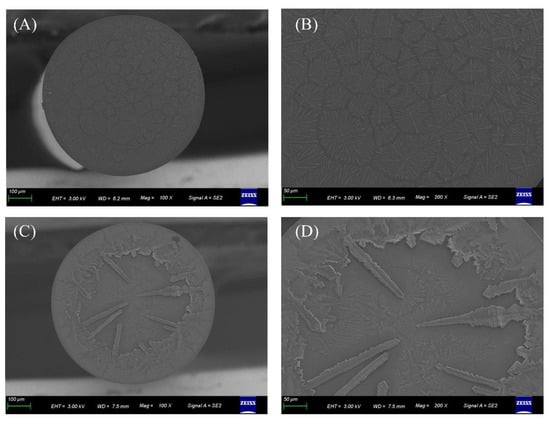 Generation and characterization of the AMEC-induced red precipitates on the optical fiber tips. (A–D) SEM images of the optical fiber tips when submerged into AMEC solution to react with HRP bonded on the second antibody to attain signals up to 1.4 nm (A,B) and 16 nm (C,D).