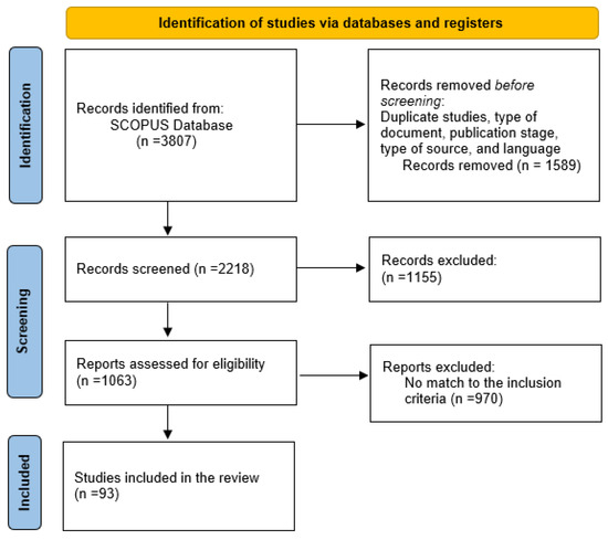 For the selection of articles, the criteria involved the revision of the document title, the abstract, and the skimming of the article. Furthermore, the inclusion and exclusion criteria were also applied. A selection process based on the PRISMA flowchart [38], presented in Figure 2, was also used.