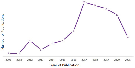 Interest in indoor occupancy detection and estimation using environmental sensors has been growing over the years and has led to an increase in the annual output of articles in the related domain from 2009 to 2021 (Figure 3). Lam et al. [41], pioneer in this domain, developed algorithms to calculate the number of occupants based on the analysis of the environmental data obtained. Later, in the year 2012, the research interest in this domain had a strong increase. In subsequent years from 2012 to 2017, the number of scientific publications on occupancy estimation increased significantly. The year with the most publications is 2017 (17 papers), while in the following years, the publication trend has slowly decreased.