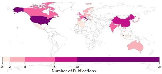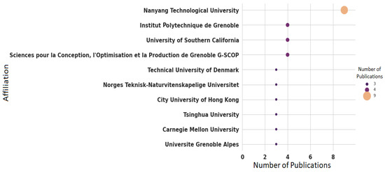 The institution with the highest number of publications related to indoor occupancy estimation is Nanyang Technological University (nine publications, representing 9.67%) in Singapore, followed by Institut Polytechnique de Grenoble (four publications, representing 4.30%) in France, University of Southern California (four publications, representing 4.30%) in USA, and Sciences pour la Conception, l’Optimisation et la Production de Grenoble G-SCOP (four publications, representing 4.30%) in France. Nevertheless, there are more than 130 institutions that have conducted research in this field, and of those 130, 99 institutions have only one publication, 25 institutions have two, and 6 institutions have three publications. Figure 7 presents the top 10 institutions that have at least three publications.
