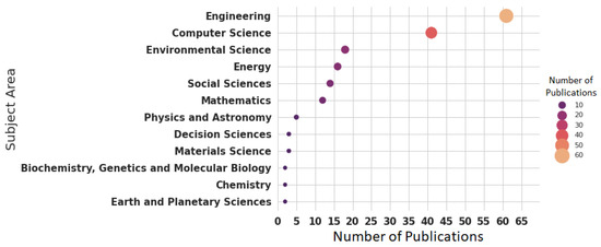 Regarding the subject areas in which the studies are published (Figure 5), most of the studies are concentrated in the field of Engineering (65.59%) and Computer Science (44.08%), followed by Environmental Science (19.35%) and Energy (17.20%). However, the publications related to subjects such as Earth and Planetary Science, Chemistry, Biochemistry-Genetics, and Molecular Biology are scarce and represent only 2.15% of the total number of publications.