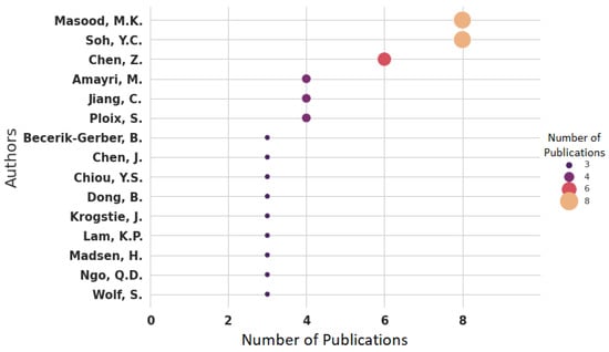 Moreover, there are about 160 authors involved in this research area. Of these authors, the number of discovered authors who have published at least three articles and are included in this systematic review is 15 (9.35%). In total, 100 authors (62.5%) have only one publication, while 42 authors (26.25%) have two publications, indicating that a limited group of researchers (three publications, representing 1.87%) have focused on this domain. The top 15 authors who have published at least three papers in the domain of indoor occupancy estimation are shown in Figure 6. The top two researchers, M.K. Massod and Y.C. Soh, are collaborating closely.