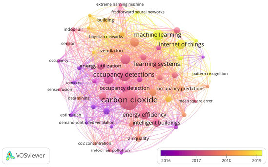 The keyword “carbon dioxide” has the highest frequency of 43. Other keywords with a high frequency include “occupancy detection” (24), “learning system” (21), “machine learning” (21), and “energy efficiency” (20). On the other hand, keywords such as “wireless sensor network”, “social interaction”, “information theory”, and “environmental sensor networks” have the lowest frequency of one.