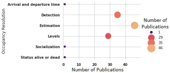 Finally, Figure 9 shows the research trends of indoor occupancy resolution presenting the changes and evolution of the desired precision over time. The number of occupants estimated in the place is more common; 46 publications (49.46%) were focused on this resolution. The second resolution most common is the detection (binary) of a person, which has been addressed in 35 publications (37.63%), followed by indoor occupancy levels, having been studied in 29 publications (31.18%). It is important to point out that of the 93 publications, 18 focused on more than one resolution.