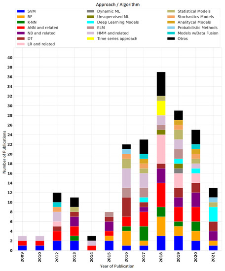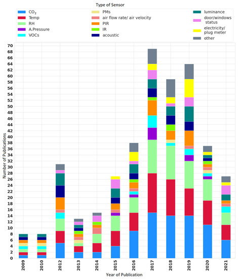 Indoor occupancy is one of the important sources of information for designing smart buildings. However, challenges such as user privacy, communication limit, and a sensor’s computational capability make it difficult to develop occupancy monitoring systems [44]. Figure 10 shows the types of sensors that have been put into use by year, from 2009 to 2021. The type of sensor that has been used most often over the years is the CO sensor. Similarly, sensors that can measure temperature and RH are also widely used for enclosed spaces. In 2017, 15 publications (16.12%) used such sensors to collect environmental data. As secondary sensors, the PIR and light/luminescence sensors have been discussed in 27 publications (29.03%) over the years, followed by the acoustic sensor being discussed in 21 publications (representing 22.5%). While the interest in the PIR sensor increased in the years 2017 and 2019 (five publications, representing 5.37%), in 2019, the interest in the light/luminescence sensor also increased (five publications, representing 5.37%). Previously, the acoustic sensor was the most discussed in 2012 by four publications (4.30%).