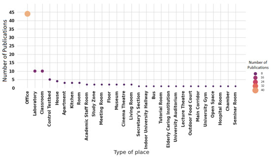 There are particular places that were considered in at least one study (1.07%), such as hospital rooms [57], a bus [58], an elderly caring institution [59], and a university gym [12]. Furthermore, in six studies (6.45%), specially designed places were used to carry out experiments [24,55,60,61,62,63].