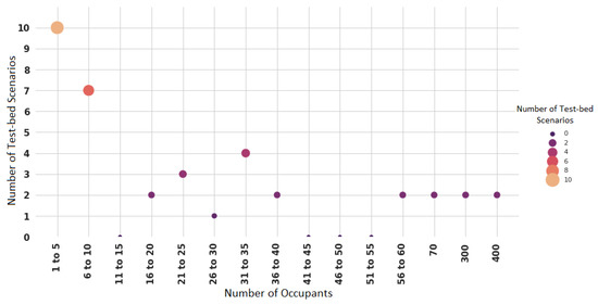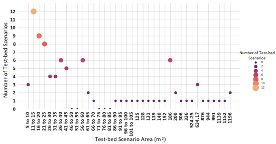 Regarding test-bed scenarios (Figure 11), the studies tend to be carried out in offices (44 publications, 47.31%) in which their area varied from 5.03 to 62.92 m, and 97 to 634.17 m. The second scenarios are classrooms (10 publications, 10.75%) with areas between 41 and 524.25 m, and laboratories (10 publications, 10.75%) with a capacity for about four to 70 occupants.
