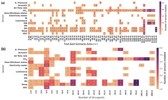Regarding the number of publications reporting on a type of sensor, 84 publications (90.32%) documented the use of the CO sensor with other sensors, while 13 publications (13.97%) described the use of the CO sensor only. For instance, Zuraimi et al. [45] installed four CO sensors within a lecture theater (876 m), obtaining a root-mean-square error (RMSE) between 19.6% and 27.4%. Other authors who had only installed one CO sensor in places with areas between 12 and 40 m obtained results with an accuracy value between 69.96% and 99.52% [46,47], between 88% and 94% [10], 86% [48], and an RMSE value of 77% [49]. In places with area between 89 and 186 m, the results had an accuracy value between 75.5% and 96.5% [50], 85.57% [7], 94% [51], and an RMSE value of 60.44% [52].