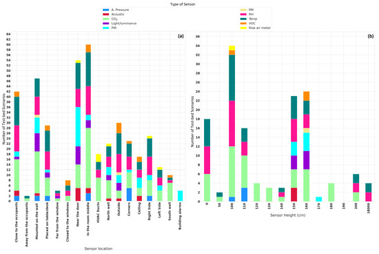 On the other hand, 32 publications (34.40%) have only used environmental sensors. Of these 32 publications, only four plublications (4.30%) have used temperature and RH sensors as the main sensors. Their results have accuracies between 83.33% and 87.03% [53], and between 95.2% and 97% [12]. Viani et al. [20,54] installed between 23 and 28 sensors in a place with an area of 1196 m to estimate occupancy levels. Their results show that the detection phase was able to correctly recognize more than 82% of the environmental events related to occupancy variations. In addition, Fiebig et al. [55] installed six VOC sensors to detect presence and estimate the occupancy levels in a place with an area of 60 m, obtaining F1 scores for a binary classifier between 62% and 94%, while for multiclass, scores were between 15% and 94%. On the other hand, Weekly et al. [56] had used eight PM sensors combined with eight airflow sensors in a corridor to detect presence.