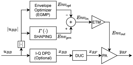 The remainder of this paper is organized as follows. A detailed explanation of the proposed EOPT approach for wideband ET PAs is given in Section 2, including an in-depth description of the main key subsystems contributing to define the power efficiency and linearity trade-off in ET PAs. The proposed envelope optimization approach is validated on an SoC ET PA board, considering an NR-60 MHz OFDM-like test signal. Thus, experimental results are shown in Section 3, comparing the linearization performance of the proposed EOPT method, which is agnostic of the ETM behavior, with the ELC or I-Q DPD linearization methods. Finally, a conclusion is given in Section 4.