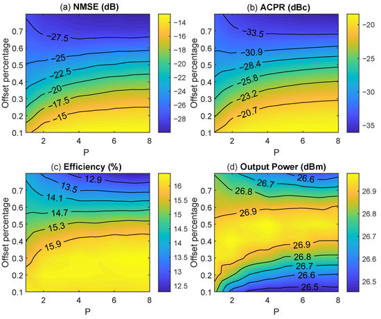 Figure 2 shows the evolution of key performance indicators such as the adjacent channel power ratio (ACPR), the normalized mean square error (NMSE), the drain power efficiency, and the output power for different configurations of the OP and p parameters when considering an NR-60 MHz OFDM-like test signal. As observed in Figure 2, the offset percentage is a key parameter that significantly impacts both the linearity (in terms of NMSE and ACPR) and the drain power efficiency. The higher the OP, the better the linearity but the lower the drain power efficiency. The efficiency can reach 16% when the OP is 0.1, which has the worst ACPR of around −20.7 dBc. When the and , the ACPR can reach −35 dBc but the efficiency drops to around 13%.