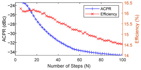Figure 3 shows the ACPR and efficiency performance of the SR envelope with different configuration of . The SR process is applied on top of the detroughed envelope with a given configuration of and , corresponding to an original ACPR around −24 dBc and drain power efficiency around 16%. As observed, the ACPR improves when increasing the number of steps . The drain power efficiency, however, is only maintained for and then decreases when increasing . A good trade-off can be found for , where the drain efficiency is around 15.9% and the ACPR is around −30 dBc.