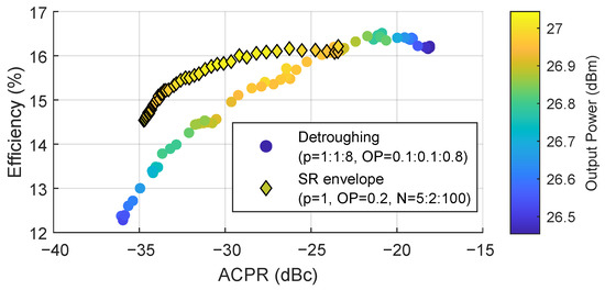 Figure 4 shows the scatter plot of the drain power efficiency and ACPR for both the detroughed envelope and the SR reduced envelope, using all the searching test results from Figure 2 and Figure 3. Therefore, Figure 4 shows the power efficiency and linearity trade-off regardless of the envelope generation configuration. Comparing the results obtained with the SR reduced envelope and the detroughed envelope, when the power efficiency is similar (e.g., power efficiency around 16%), the ACPR performance using the detroughed envelope is only −25 dBc. Instead, by using the SR reduced envelope, it is possible to reach −30 dBc of ACPR. Therefore, with the SR reduction algorithm, it is possible to improve the ET PA linearity at the price of degrading the power efficiency. As observed, the number of steps can be properly chosen to avoid a significant degradation of the drain power efficiency.