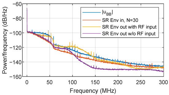 However, even after SR reduction of the supply envelope, the ACPR requirement of −36 dBc is still not met, and thus further linearity enhancement is required. As discussed in [19], another source of nonlinear distortion of the ET PA system is the RF to envelope leakage. Due to the intrinsic design of the ETM, the ETM output impedance is not a perfectly constant low value. As a consequence, the distortion at the RF PA output is leaked into the envelope supply path (i.e., the output port of the ETM). This leakage is combined with the supply envelope, causing nonlinear distortion at the RF PA output. Figure 5 shows the spectra of the supply envelope at the ETM output when considering the amplification of an SR reduced envelope (). When there is no RF input signal, the ETM can amplify the SR reduced envelope up to its bandwidth limitation. Instead, when the RF input is turned on, some RF leakage is added to the ETM output spectrum, as observed in Figure 5. In the latter case, the spectrum of the amplified supply envelope presents a similar shape to the spectra of the original envelope of the baseband input . The envelope linearization method proposed in this paper to meet the required linearity specifications is described in the following subsection.