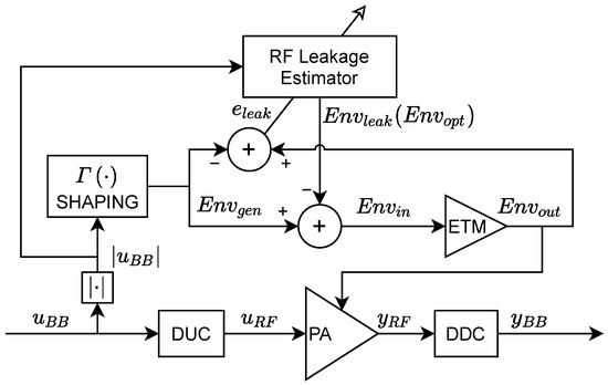 When the ETM output is available, the EGMP model can be trained to predict the RF leakage at the ETM output. Then, this RF leakage estimation is injected in counter-phase to the envelope input to perform the leakage cancellation at the ETM output. For the sake of completeness, Figure 6 shows the block diagram of the RF leakage compensation approach proposed in [19], which uses the leakage estimation , instead of in (6). The leakage is extracted by subtracting the ETM output measurement with the original generated envelope as