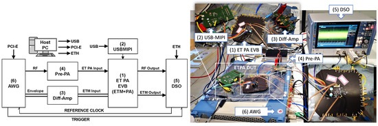 Simplified block diagram and picture of the ET PA linearization test bench. The labels are as follows: (1) ET PA EVB: HiSilicon’s ET PA evaluation board including ETM and RF ET PA; (2) USB-MIPI: FTDI USB to MIPI bridge; (3) Diff-Amp: Differential amplifier THS4508RGT from Texas Instruments; (4) Pre-PA: RF pre-amplifier ZHL-42 from Minicircuits; (5) DSO: Digital oscilloscope RTP084 from Rohde and Schwarz; (6) AWG: Arbitrary waveform generator M8190A from Keysight.