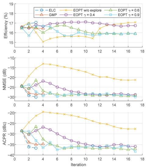 Power efficiency, NMSE, and ACPR performance per iteration of different linearization approach.
